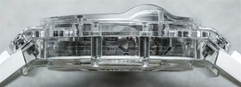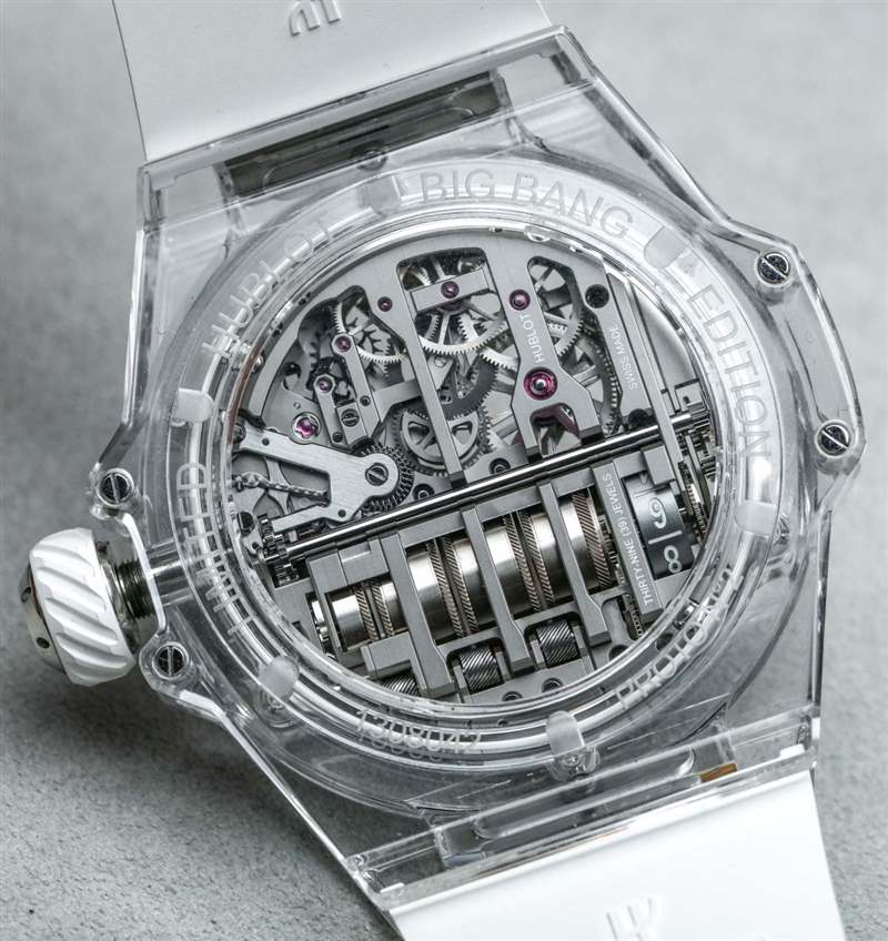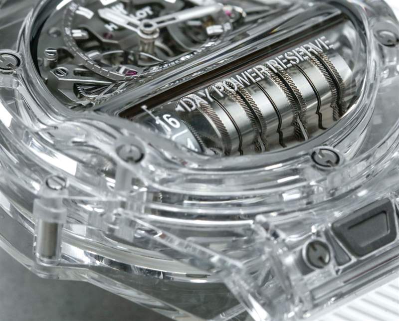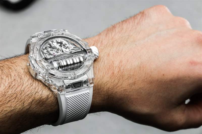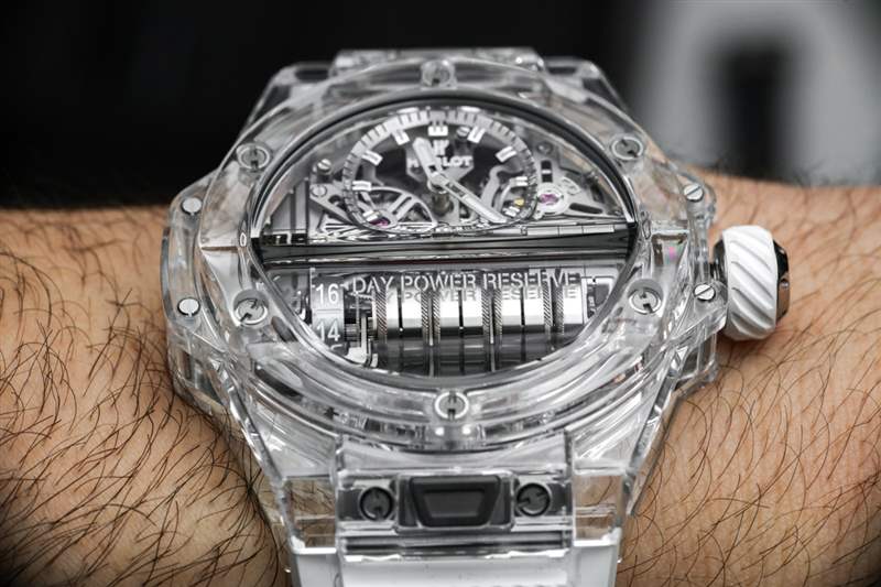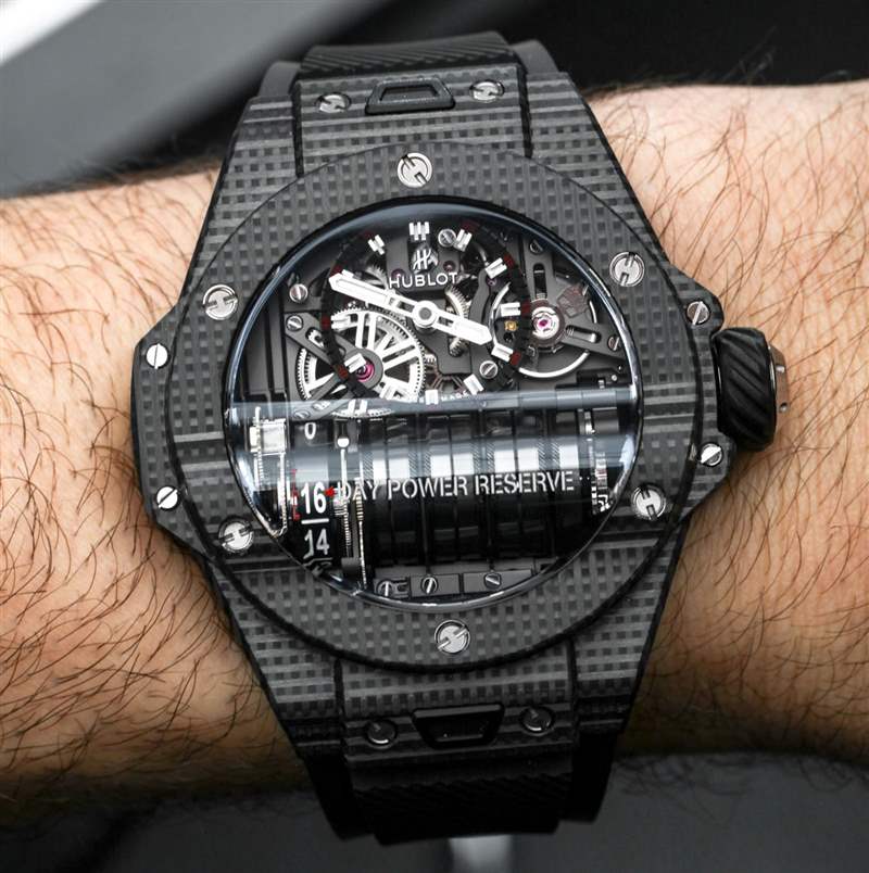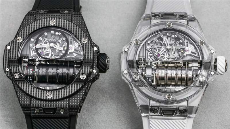 MP-11 是一款可靠的產品,因為它或多或少地使用了標志性的宇舶 Big Bang 風格表殼和具有 14 天動力儲存的機芯。這使得該模型在美學吸引力方面不那么“小眾”,在我看來,這與宇舶作為機芯設計師的優勢以及熟悉的 Big Bang 表殼美學的獨特外觀很好地聯系在一起。2018 年 MP-11 Power Reserve 14 天作為參考號 911.QD.0123.RX 碳纖維和參考號 911.JX.0102.RW 藍寶石水晶。表殼寬 45 毫米,防水深度達 30 米,并且比標準的 Big Bang 表殼稍厚,考慮到容納從手表正面可見的一排主發條盒所必需的“凸塊”。