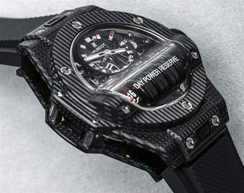 這款手表采用藍寶石水晶制成,具有可愛的外觀,可提供您對透明時計的一切期望。從各個角度欣賞機芯的能力以及了解材料極耐刮擦的能力是佩戴此類“以機芯為重點”的豪華手表時的主要優勢。2018 年限量版還有 Hublot MP-11 Power Reserve 14 Days 3D Carbon。乍一看,這看起來像宇舶的傳統碳纖維表殼。它不是。宇舶聲稱這是一種碳纖維(與碳纖維相比),外觀簡潔。宇舶還在其 2018 年限量版宇舶 MP-09 的表殼中使用了這種新穎的“3D 碳”材料。3D Carbon 摸起來很光滑,但有一個有趣的圖案,它像碳纖維一樣深,但表面更啞光,使它成為碳纖維和黑色陶瓷之間的一個很好的中間地帶。鑒于它是碳,3D 碳外殼材料非常輕便。請注意,考慮到表殼側面是藍寶石水晶的感覺有多酷,即使是 MP-11 的 3D 碳表殼版本也有藍寶石水晶面。
