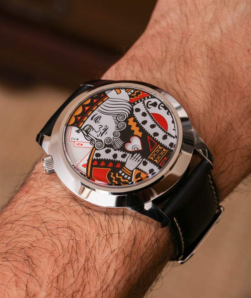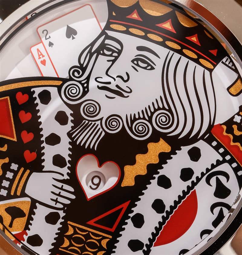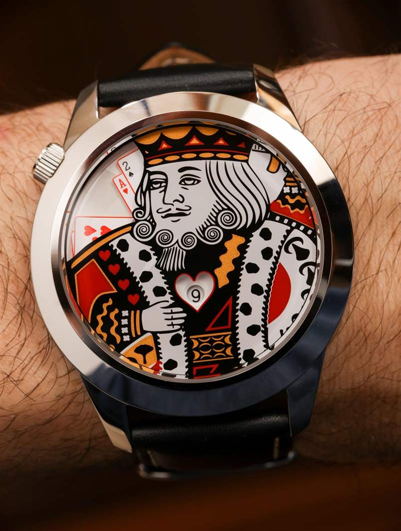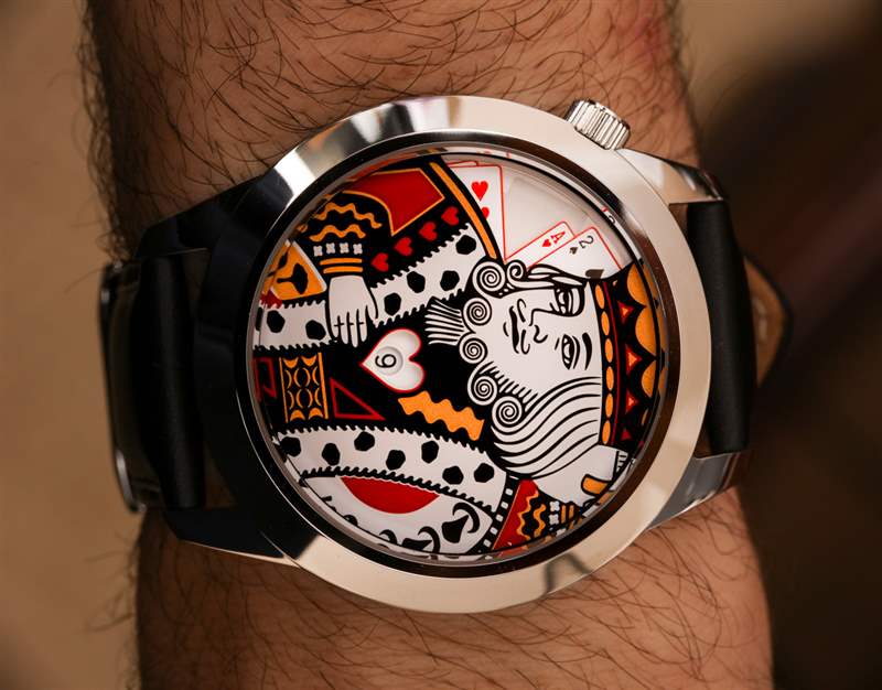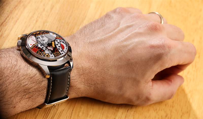 雖然 King XL 的技術元素滿足了我作為手表愛好者的需求,但這種類型的時計并不是要給其他手表書呆子留下深刻印象。這是一款時尚手表,當您認為在身上佩戴撲克牌 King 角色會增加您想要傳達的風格信息時。表盤顯然不是最清晰的,小時指示器的心形窗口都在較小的一側,考慮到表盤的深度,很難從某個角度閱讀。所以這意味著要輕松閱讀這個表盤,你需要直接看它。您也無法真正將時間精確到分鐘。分鐘指示器盤有六個指示器——一個小時內的十分鐘段中的每一個。Ace 牌用來表示“10”,而其他數字牌則用來表示十分鐘的各個部分。您可以以 2-4 分鐘的精度讀取時間。用我們的手機,考慮到這款手表是為了好玩——我可以原諒這一點,我只想知道這不是一款運動手表,也不是我想經??词直頃r戴的手表為了告訴時間。我認為 King XL 在社會吸引力方面彌補了它缺乏易讀性的原因。
